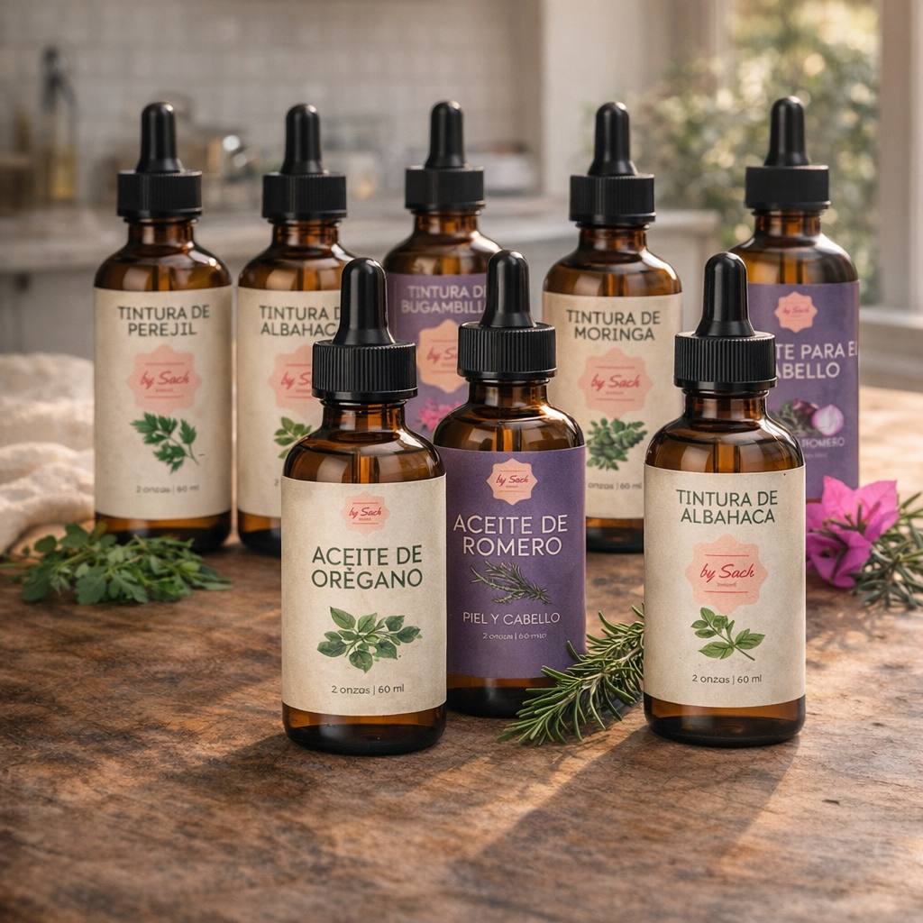 Cada aceite es elaborado por mí, utilizando plantas reales que cultivo y recolecto personalmente en mi patio.